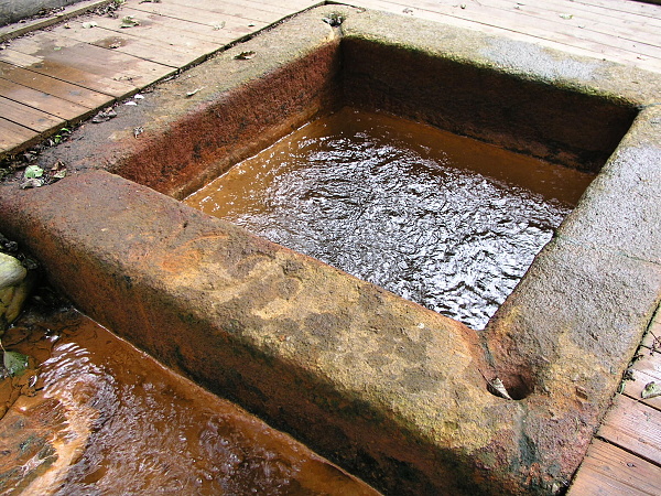 Jímání: kamenná žulová čtvercová jímka s odtokovým otvorem